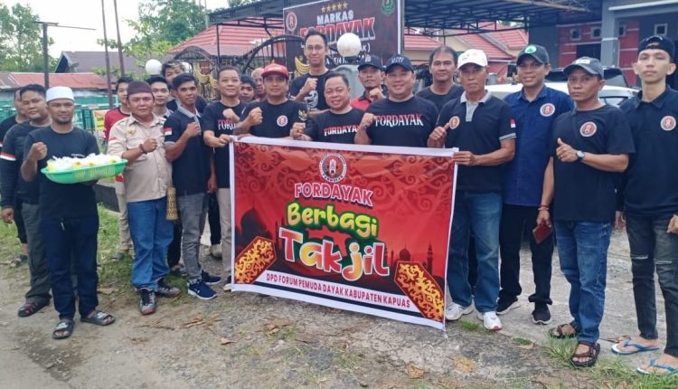 KUALA KAPUAS,humanusantara.com – Dewan Pimpinan Daerah (DPD) Forum Pemuda Dayak (Fordayak) Kabupaten Kapuas, Kalimantan Tengah (Kalteng) berbagi takjil, sebagai upaya memperkokoh silaturahmi dan menebarkan kebagian bersama umat muslim disaat bulan suci ramadan.