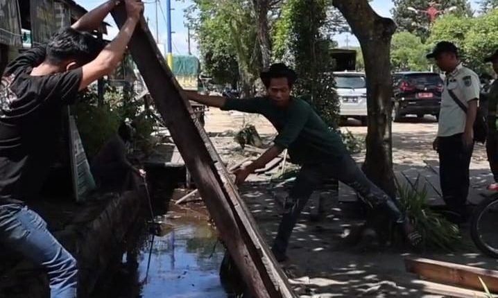“Bangunan yang atapnya menjulang dan lantainya melintang di atas parit kami bongkar. Ini penting agar saluran air tidak tersumbat,” kata Berlianto, Jumat (9/5/2025).