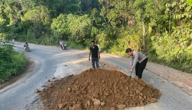 Luar Biasa! Cegah Lakalantas, Personel Polsek Kahut Turun Tangan Timbun Jalan Rusak