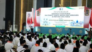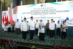 SURABAYA,humanusantara – Menteri Agraria dan Tata Ruang/Kepala Badan Pertanahan Nasional (ATR/BPN) Nusron Wahid, bersama Gubernur Jawa Timur Khofifah Indar Parawansa, menyerahkan sebanyak 2.532 sertipikat tanah wakaf dan rumah ibadah.